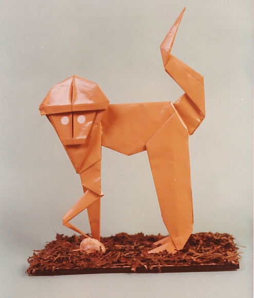 Scimmia ottenuta con 2 fogli di carta quadrata da cm. 40, con uno viene realizzata la parte anteriore (testa e zampe) e l'altro per completare la parte posteriore (corpo, zampe e coda).
